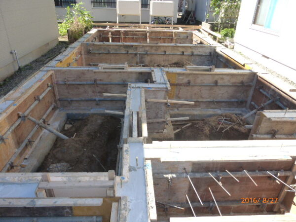 型枠にコンクリートを流し込んで家の土台となる大事な部分の基礎を作っています ↓